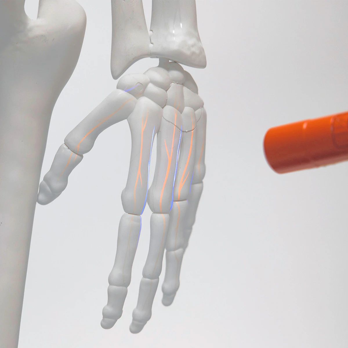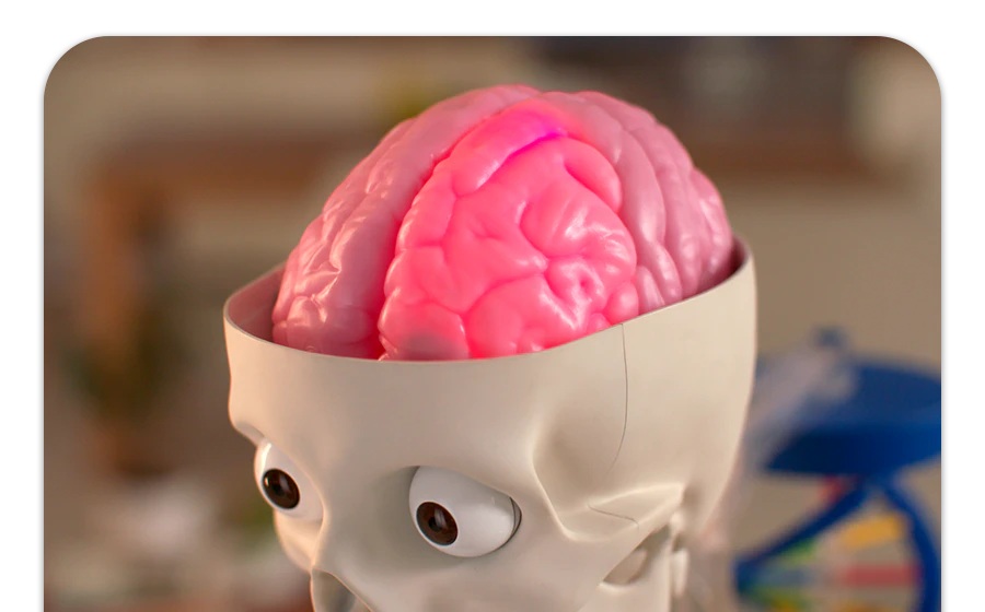 Но това не е всичко! Скели е пълен със специални ефекти: Той има над 200 аудиозаписа, които можеш да слушаш, мозъкът му свети, за да покаже четирите му дяла, а с UV фенерчето можеш да видиш вътрешността на костите му!