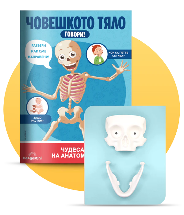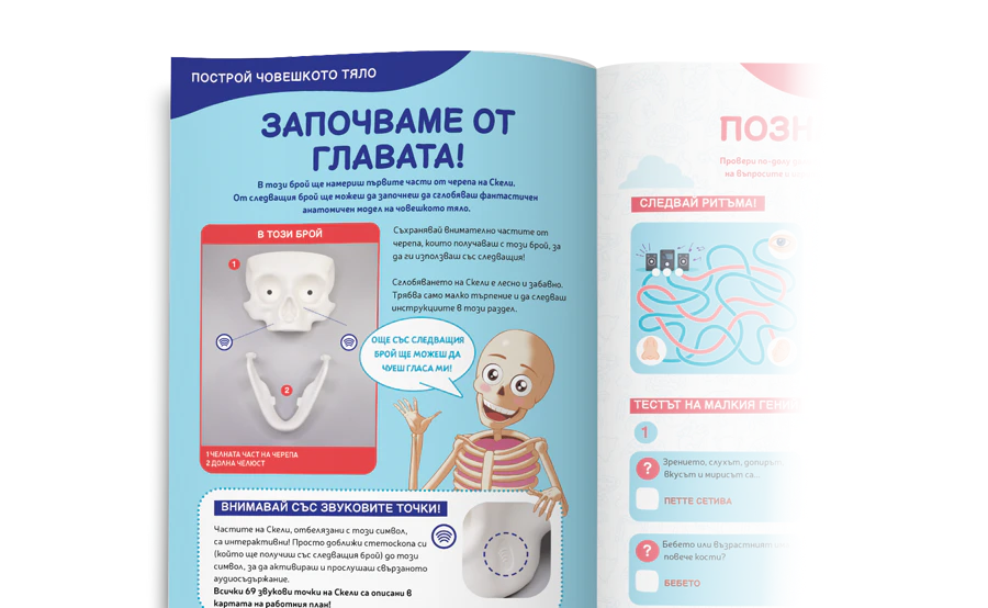 Във всеки брой ще откриеш една или повече части от модела и книжка с много теми, любопитни факти и игри, за да изследваш по увлекателен начин всички чудеса на анатомията!