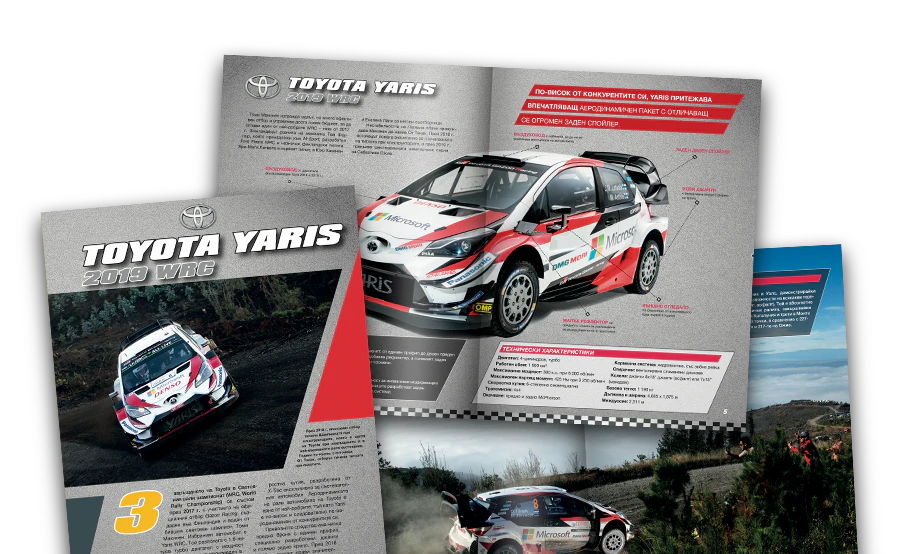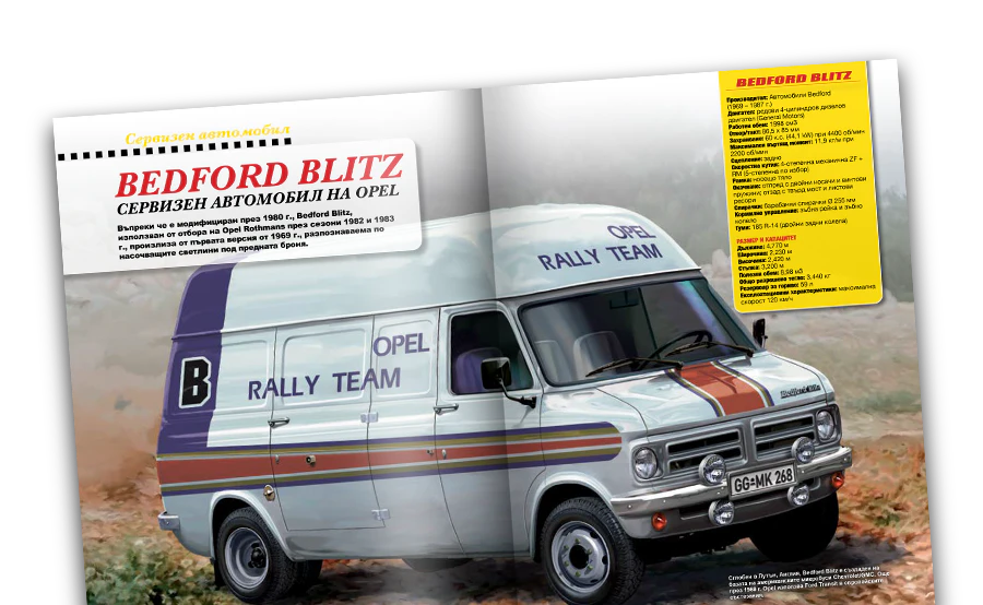 Прекрасна цветна илюстрация на сервизния автомобил, представен в броя, придружена от подробна техническа характеристика. Открийте тайните на сервизните екипи, които оказват помощ и благодарение на чиято подкрепа великите пилоти успяват да се изкачат на подиума на победителите.