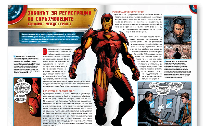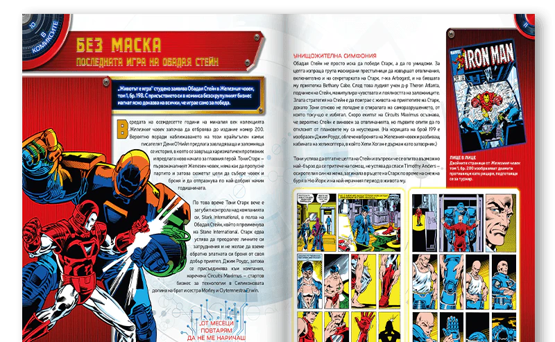 Надникнете в света на Железния човек в комикса: разберете всичко за приятелите и враговете му, за компаниите, изобретенията и тайната му самоличност. Включва специални статии за историята на издателството, най-силните епохи, емблематичните корици…