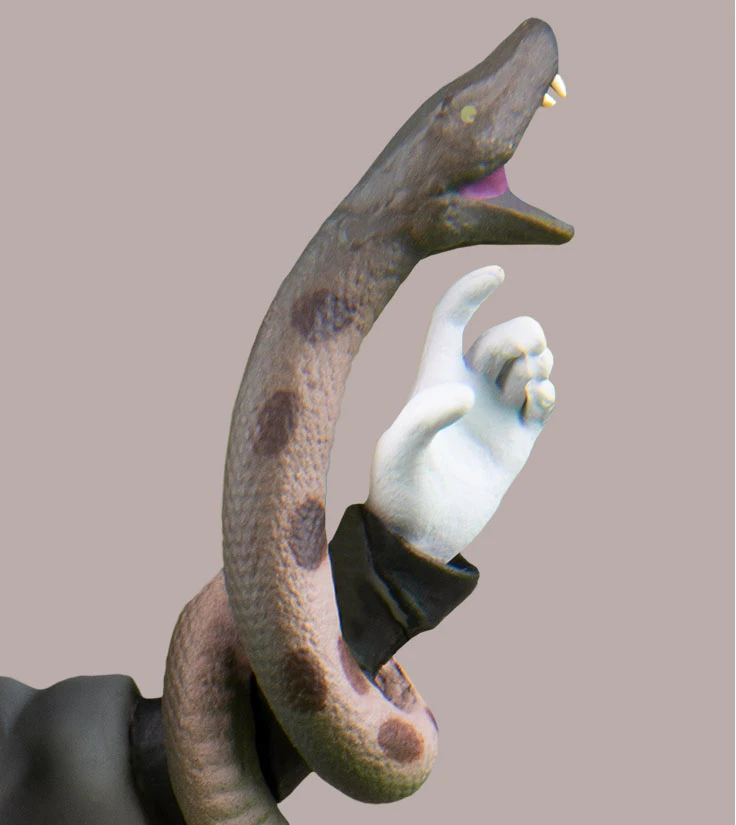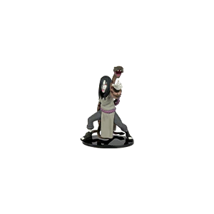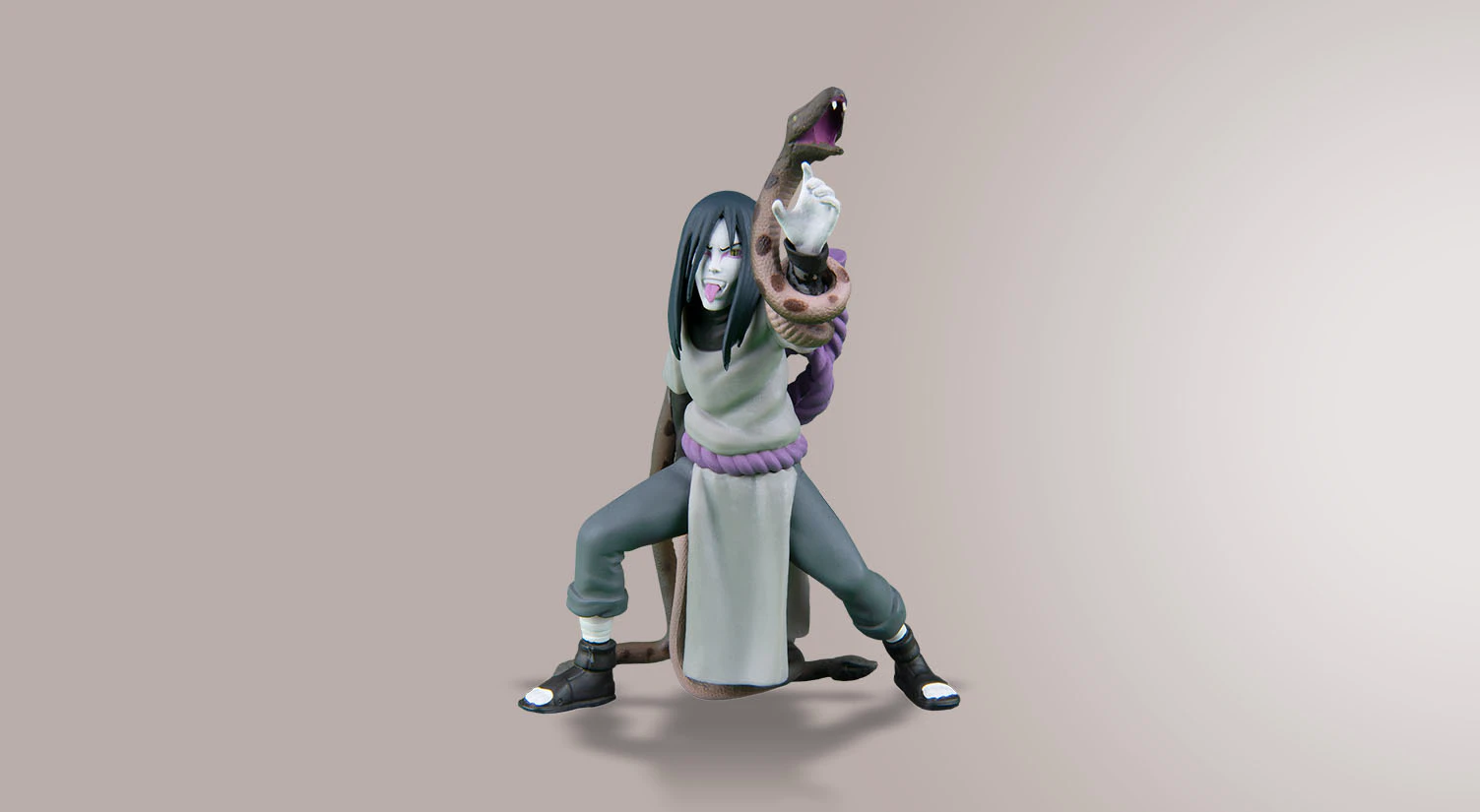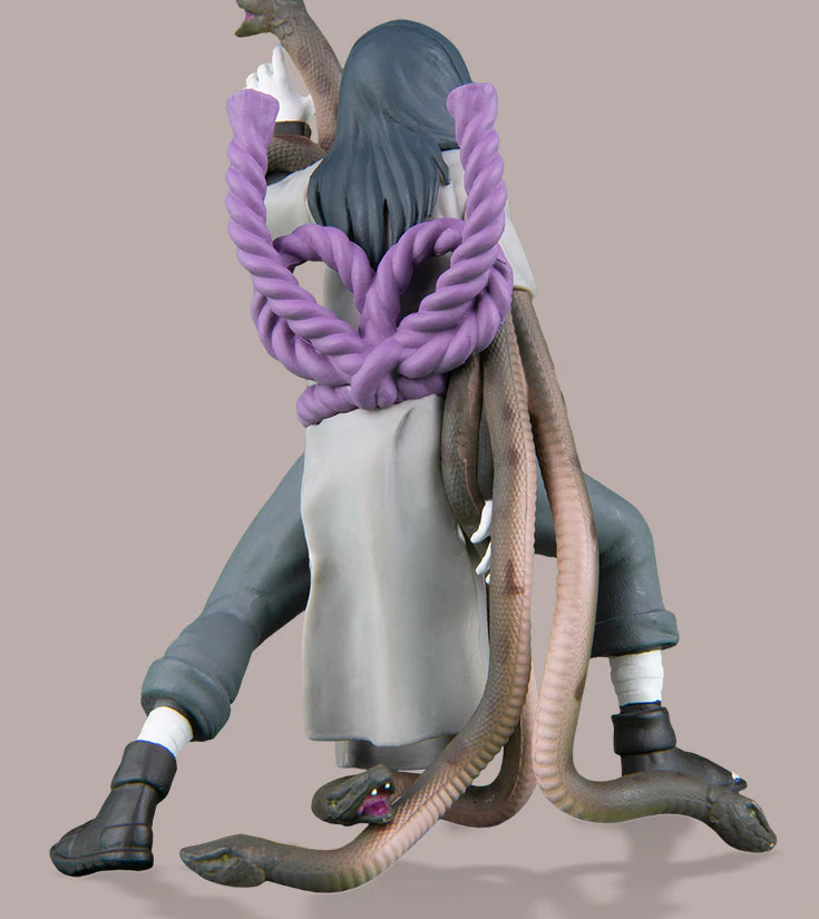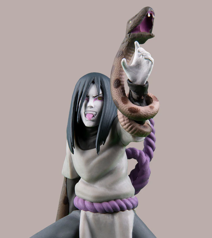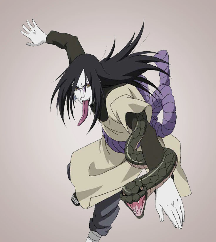 Mnoho Oročimaruových útoků zahrnuje použití jedovatých hadů, což vede ke znepokojivým scénám, jako je ta na obrázku. Had omotaný kolem jeho levé paže zdůrazňuje hrozbu, kterou tento nelítostný padouch představuje.