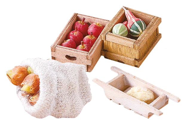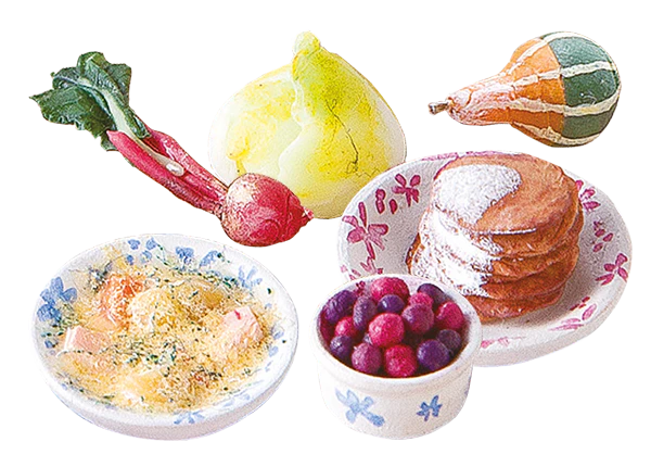 Výběr replik jídel, na kterém si muminci pochutnávají v kuchyni.