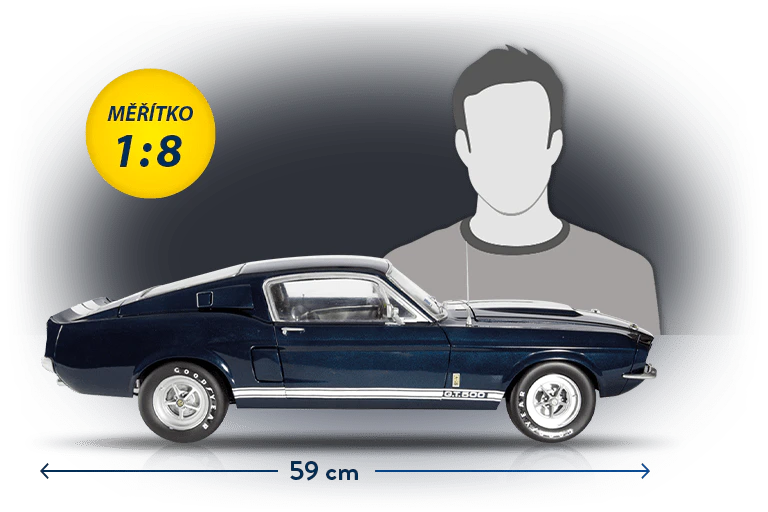 Model je vyrobený z prvotřídních materiálů, včetně kovových odlitků vstřikovaných do forem. Dveře a okna mají mechanismus otevírání a zavírání. Oslavte 55 let od vzniku legendárního vozu Shelby GT-500™, který se inspiroval slavným Mustangem, postavením vlastního modelu v měřítku 1 : 8!