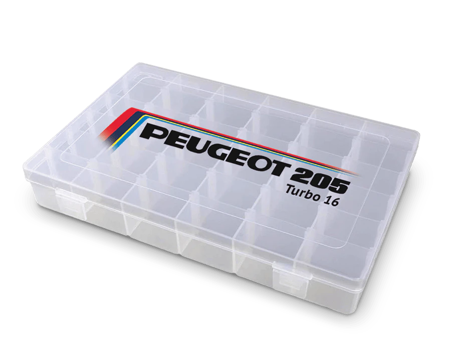 Nezbytná skříňka na nářadí pro organizaci a bezpečné uložení náhradních dílů a šroubků při stavbě modelu 205 Turbo 16.