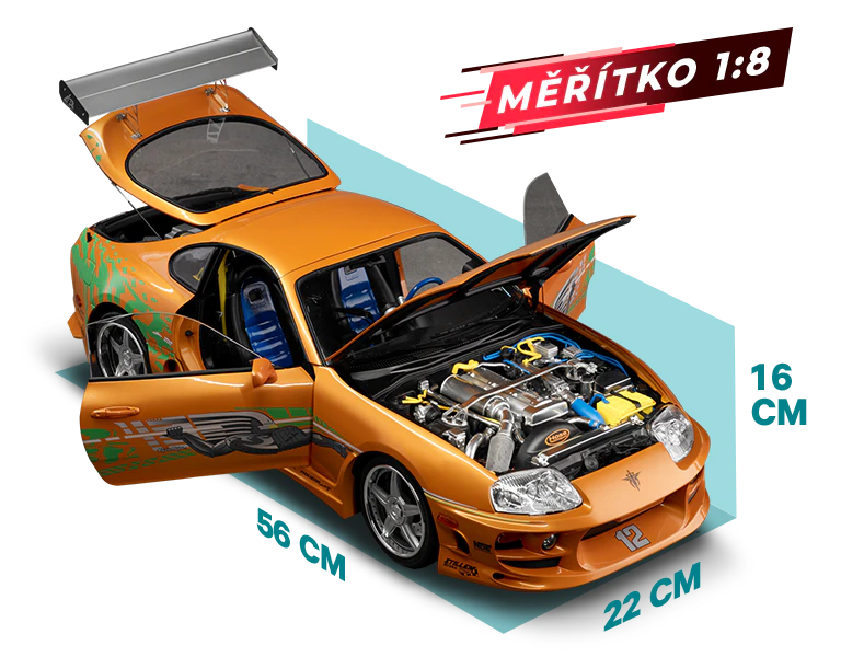 Prožijte s touto úžasnou replikou legendárního vozu Toyota Supra MK IV, kterou ve filmu Rychle a zběsile řídil Brian O‘Conner, znovu všechny vzrušující okamžiky ságy. Nezaměnitelný design a precizní provedení tohoto modelu vystihují samou podstatu jednoho z nejikoničtějších a nejokázalejších vozů této ságy. Pro opravdové fanoušky a sběratele je to tedy naprosto nepostradatelný kousek!