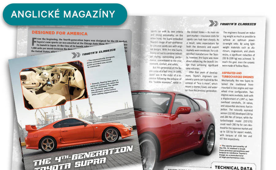 Toyota Supra MK IV, která figurovala ve filmu Rychle a zběsile (2001), je jedním z nejikoničtějších japonských sportovních vozů 90. let. Tento model je obdivován zejména pro svůj výkonný motor a možnosti tuningových úprav.