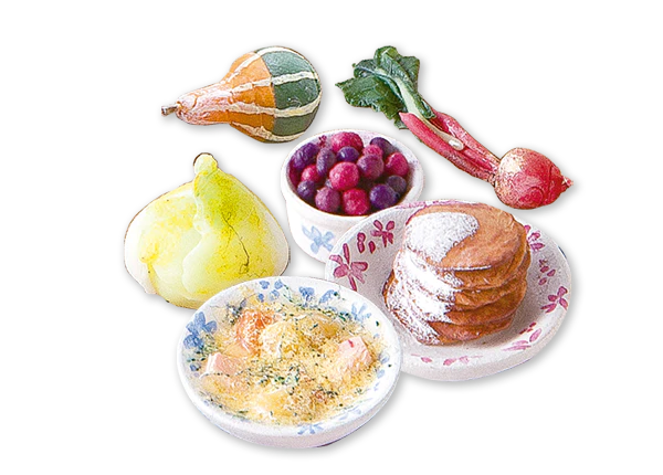 Eine Auswahl an nachgebildeten Lebensmitteln, genau wie das Essen, das die Mumins in der Küche genießen.