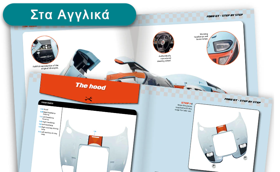 Το εικονογραφημένο περιοδικό περιέχει τον οδηγό συναρμολόγησης με σαφείς, βήμα προς βήμα οδηγίες, συνοδευόμενες από λεπτομερείς φωτογραφίες, για να κάνετε την κατασκευή του Ford GT σας όσο το δυνατόν πιο εύκολη.