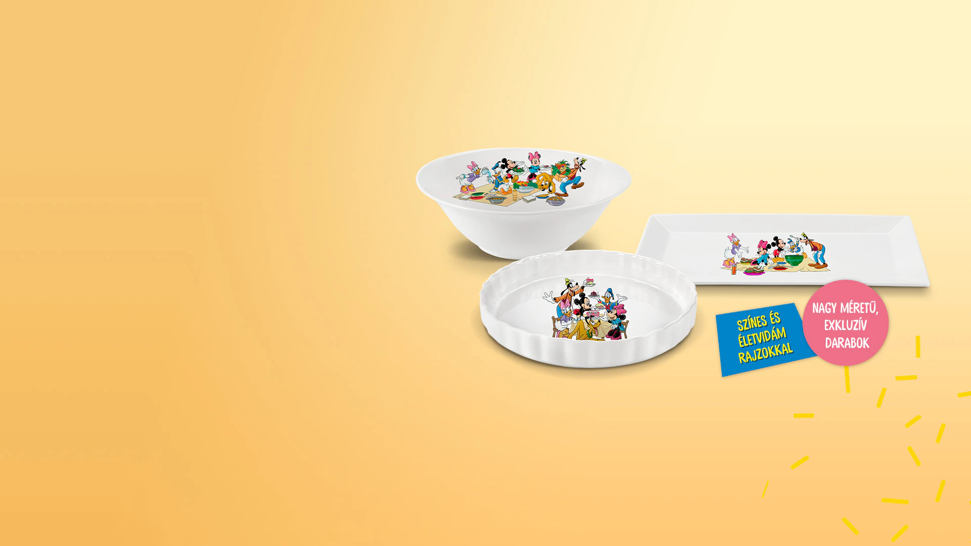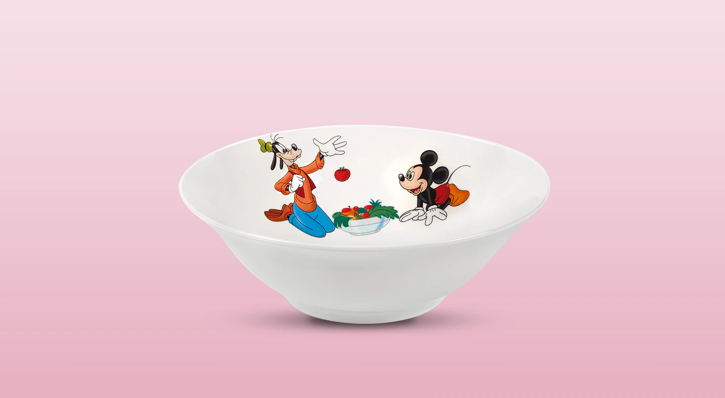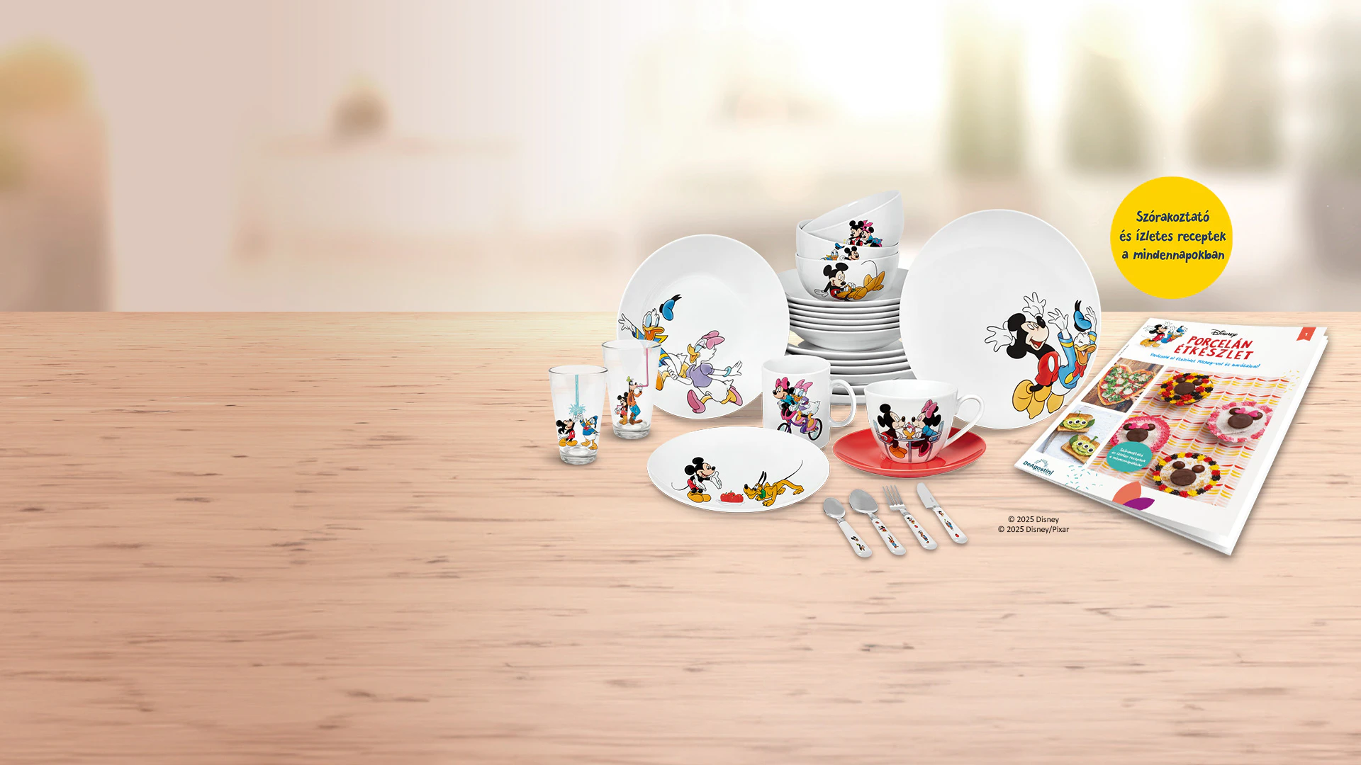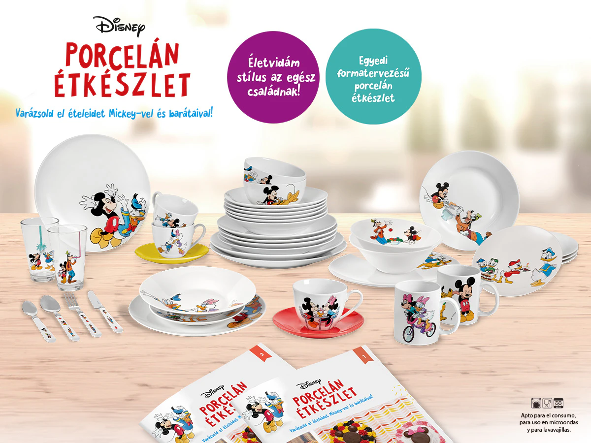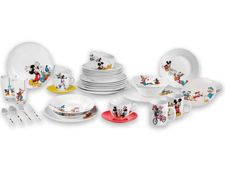 A legikonikusabb Disney-figurákkal díszített, kihagyhatatlan fehér porcelán kollekció: Mickey egér, Donald kacsa, Minnie egér, Daisy kacsa, Plútó, Goofy kutya, Tiki, Niki és Viki