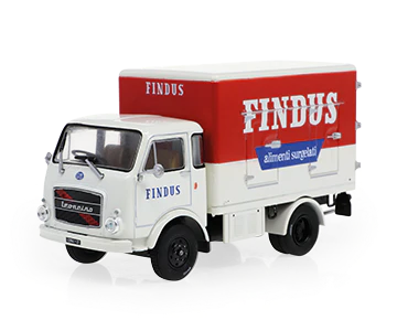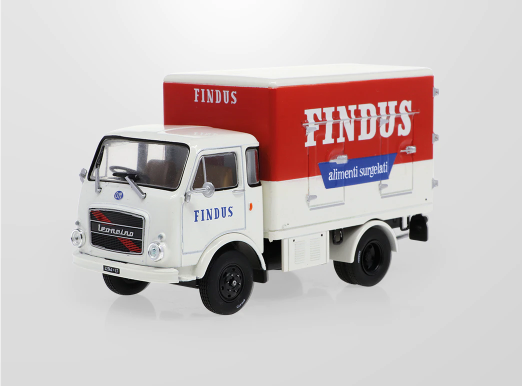 Questo Leoncino sesta serie, prodotto dal 1965 al 1968, porta la livrea unifi cata bianca e rossa utilizzata all’epoca dalla Findus per i veicoli che in tutt’Europa erano utilizzati per distribuire i prodotti ai punti vendita. Solitamente erano allestiti con una cella isotermica a piastre eutettiche, accumulatori di freddo che evitano l’installazione di un gruppo frigo.
