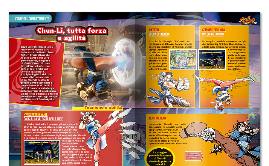 Approfondimenti e spiegazioni sulle varie tecniche di combattimento sfoggiate nella saga. Ogni personaggio ha le proprie mosse preferite, con combo micidiali e altre abilità che lo rendono unico. Rivivi l’emozione di imparare a usare per la prima volta l’Hadoken, lo Shoryuken, lo Hyakuretsukyaku e altri colpi devastanti… Combatti!
