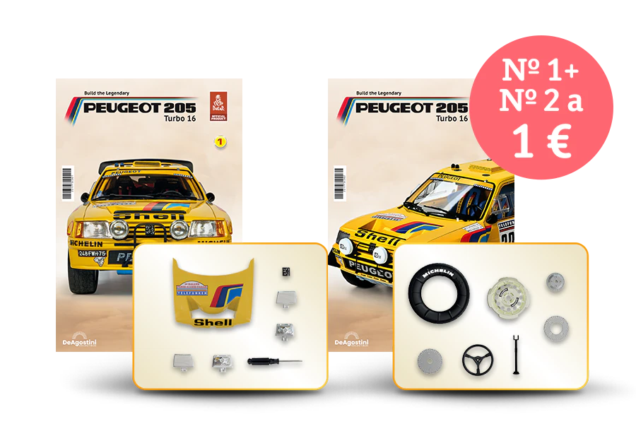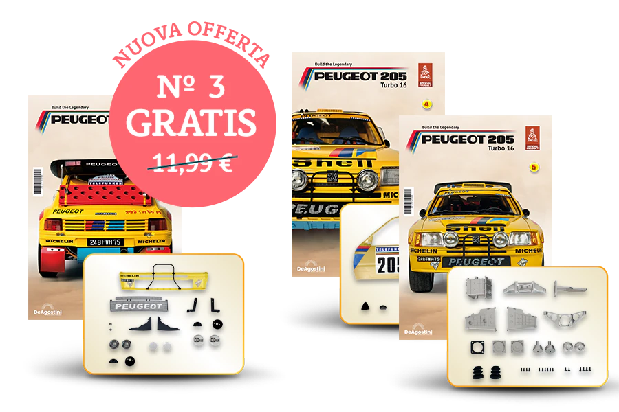 Ora puoi assemblare il tuo modello in scala 1:8 della spettacolare Peugeot 205 Turbo 16 Grand Raid, vincitrice della Parigi-Dakar del 1987 con l’equipaggio Ari Vatanen e Bernard Giroux. Questo modello esclusivo è un'aggiunta prestigiosa al mondo del modellismo. Divertiti ad assemblarlo e mettilo in bella mostra a casa tua.