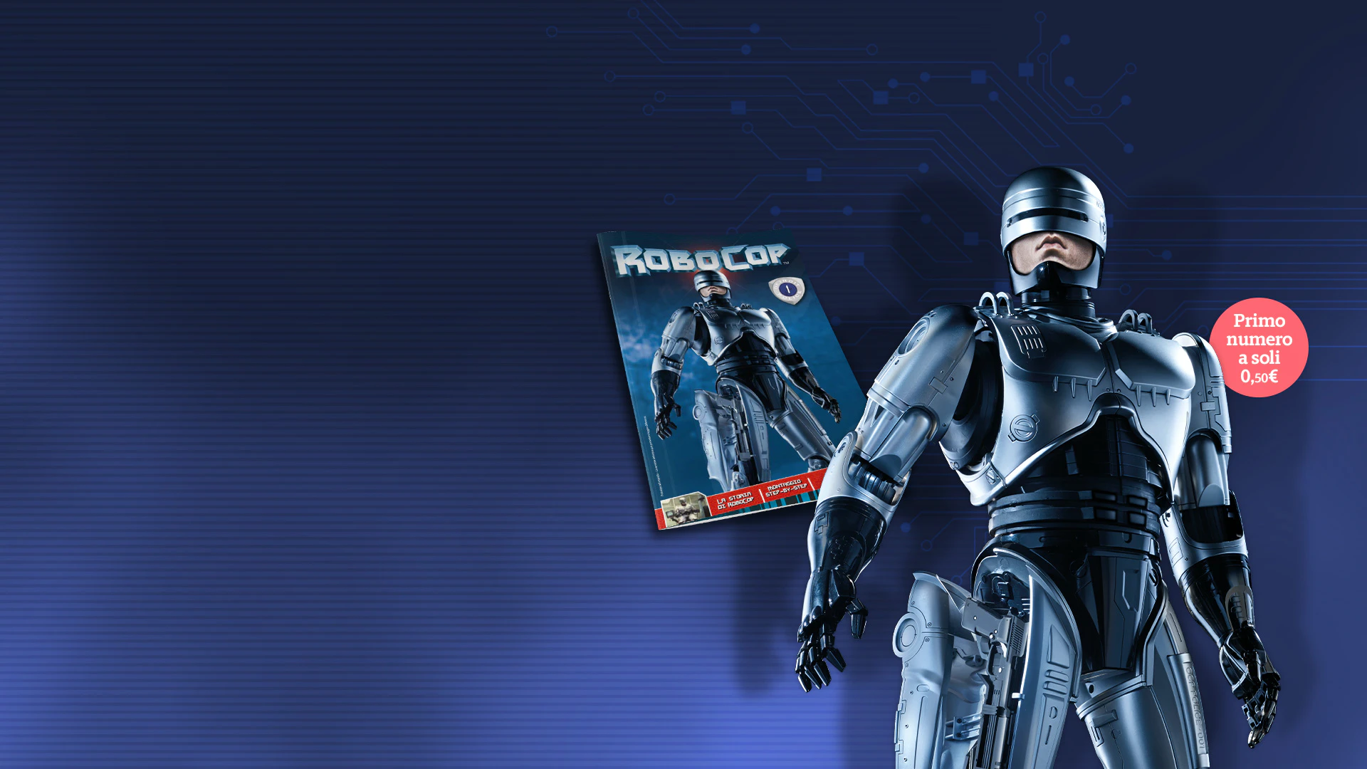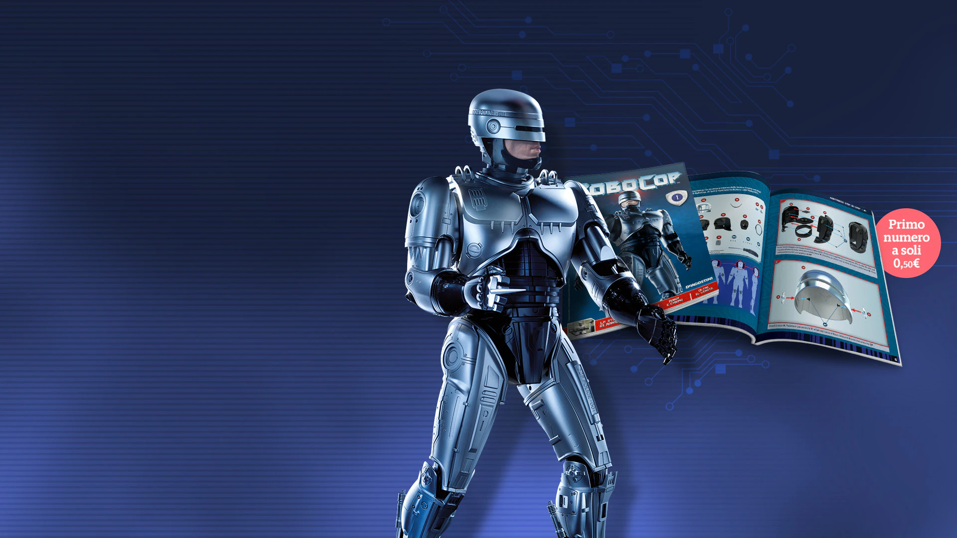 Nel film del 1987 di Paul Verhoeven, in una distopica Detroit la polizia è controllata dall'avida organizzazione OCP. Quando il poliziotto Alex Murphy, interpretato da Peter Weller, viene mortalmente ferito durante un’operazione, l’OCP decide di utilizzare il suo corpo agonizzante per creare il primo poliziotto cyborg. Nasce così la leggenda di RoboCop. Da oggi anche tu puoi costruire passo a passo il tuo RoboCop in un modello alto 62 cm!