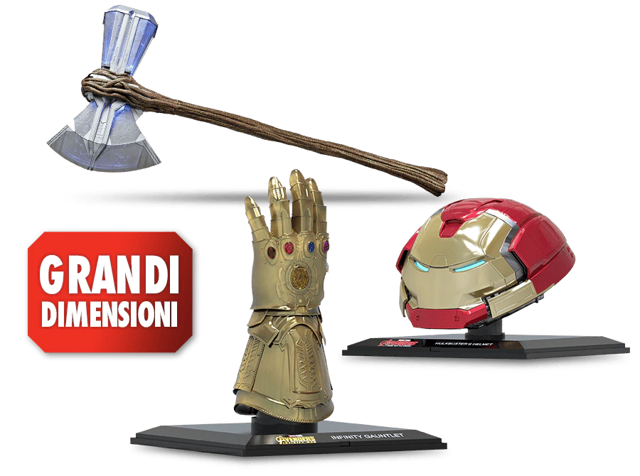 Fantastici modelli di grandi dimensioni, realizzati in metallo e ABS: il Guanto dell’Infinito, l'elmo di Hulkbuster, lo Stormbreaker (l'ascia di Thor con il potere del Bifrost), l'elmo di Thanos... e molti altri ancora!