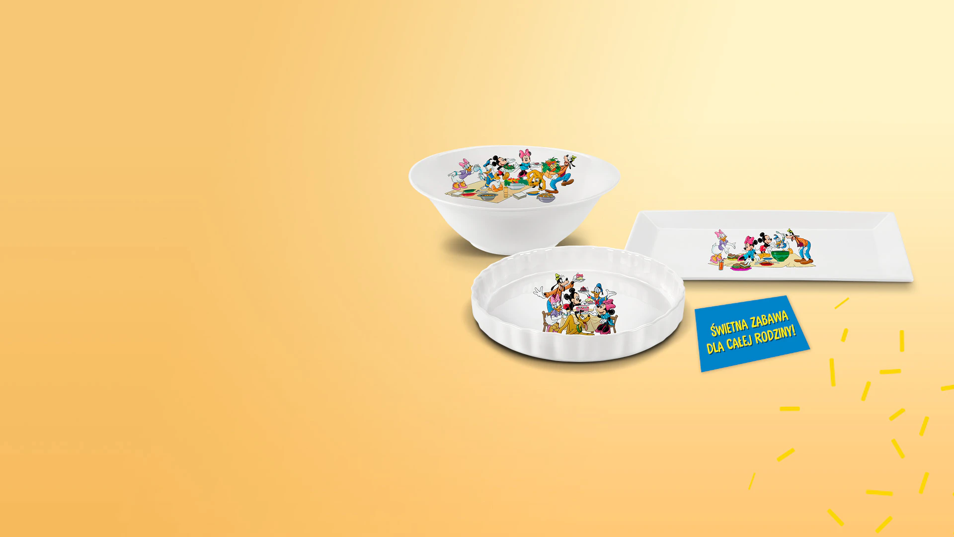 Ekskluzywna porcelanowa zastawa stołowa z kultowymi postaciami Disneya: Myszką Miki, Minnie, Kaczorem Donaldem, Daisy, Pluto, Goofym, Hyziem, Dyziem i Zyziem.