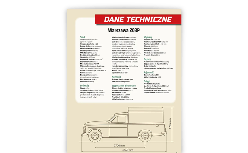 Szczegółowe parametry auta, któremu jest poświęcony dany numer. Informacje na temat silnika, podwozia, nadwozia, wyposażenia i osiągów oraz rysunek wymiarowy.