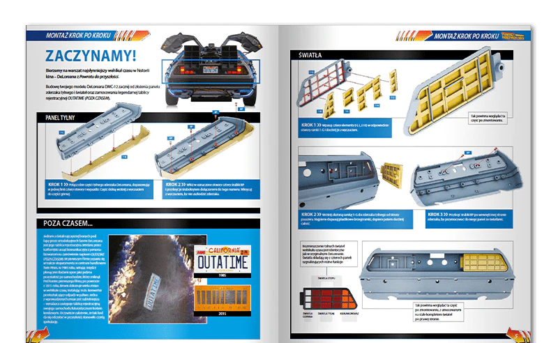 Zbuduj krok po kroku ten wspaniały model – wierną reprodukcję w skali 1:8 niezapomnianego DeLoreana – machiny podróżującej w czasie w filmie „Powrót do przyszłości”. Ta wyjątkowa replika została wykonana głównie z metalu odlewanego pod wysokim ciśnieniem. Niezwykle starannie odtworzono wszystkie detale auta oraz modyfikacje wprowadzone przez doktora Emmetta Browna. W modelu otwierają się w drzwi, maska oraz okna. Za pomocą kierownicy możesz obracać przednimi kołami. Jak w oryginale świecą się między innymi przednie reflektory, światła stopu i kontrolki deski rozdzielczej. Maksymalnie wierne odwzorowanie szczegółów jest zasługą Joego Walsera, uznawanego za światowego eksperta numer 1 od filmowego DeLoreana.