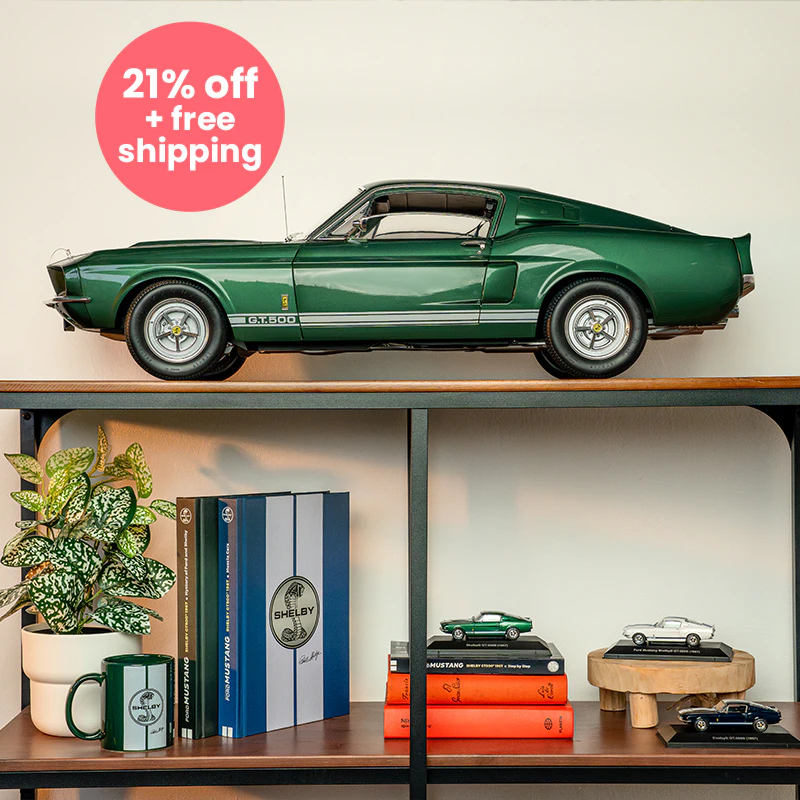 - Free gifts: The official collection mug, a 1/43 of the dark green Mustang Shelby GT500, a 1/43 of the black Mustang Shelby GT500, and a 1/43 of the white Mustang Shelby GT500